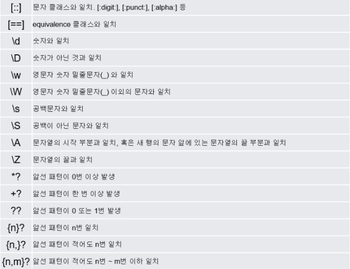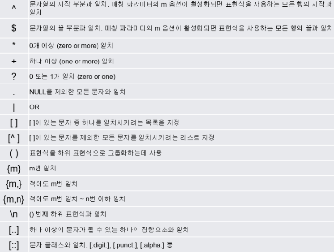 REGEXP 함수의 종류로 각 문법의 설명입니다.